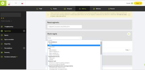 Aby zacząć segmentować bazy wystarczy utworzyć odpowiednią regułę w segmencie. W oparciu o warunki logiczne możesz stworzyć zapytania dotyczące danego pola w bazie danych. Pola w bazie to imię, email, płeć, data zapisania do bazy, temat kampanii rekrutacyjnej itd.